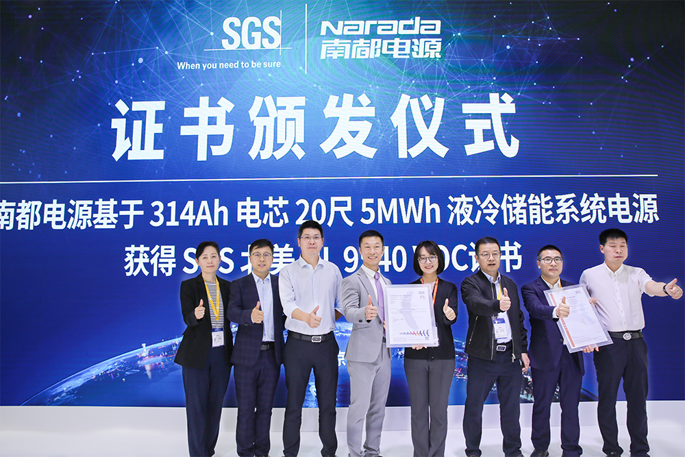At the booth, SGS, an internationally recognized testing, inspection, and certification organization, was invited to award UL1973 and UL9540 VOC certification certificates to Narada's 314Ah energy storage battery and the 20ft 5MWh liquid cooling energy storage system, respectively.