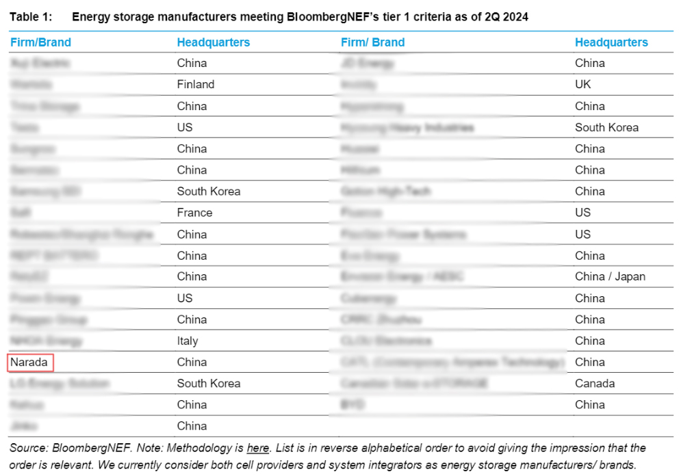 Recently, Bloomberg New Energy Finance (BNEF), a globally renowned research institution, released the Tier 1 global energy storage manufacturers list for the second quarter of 2024, with Narada maintaining its presence on the list once again.