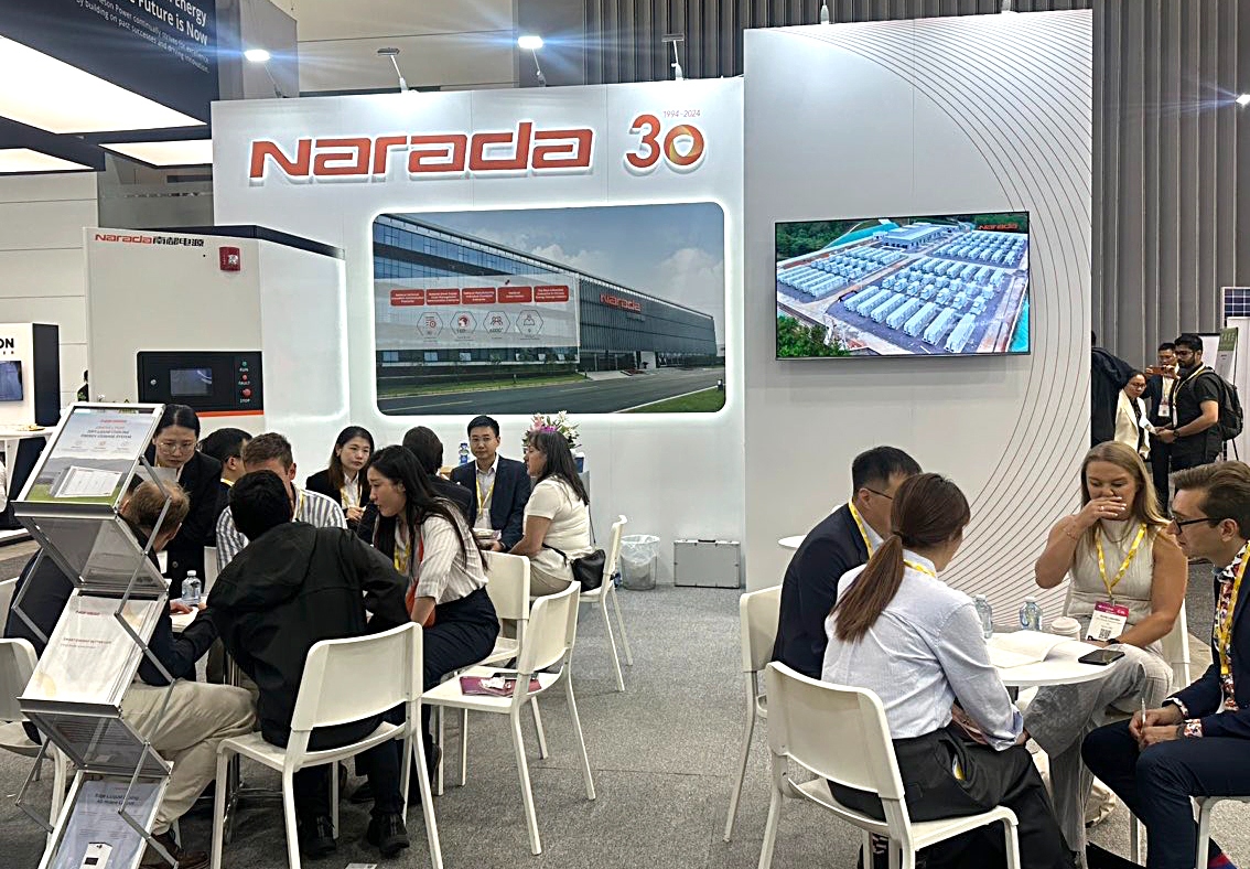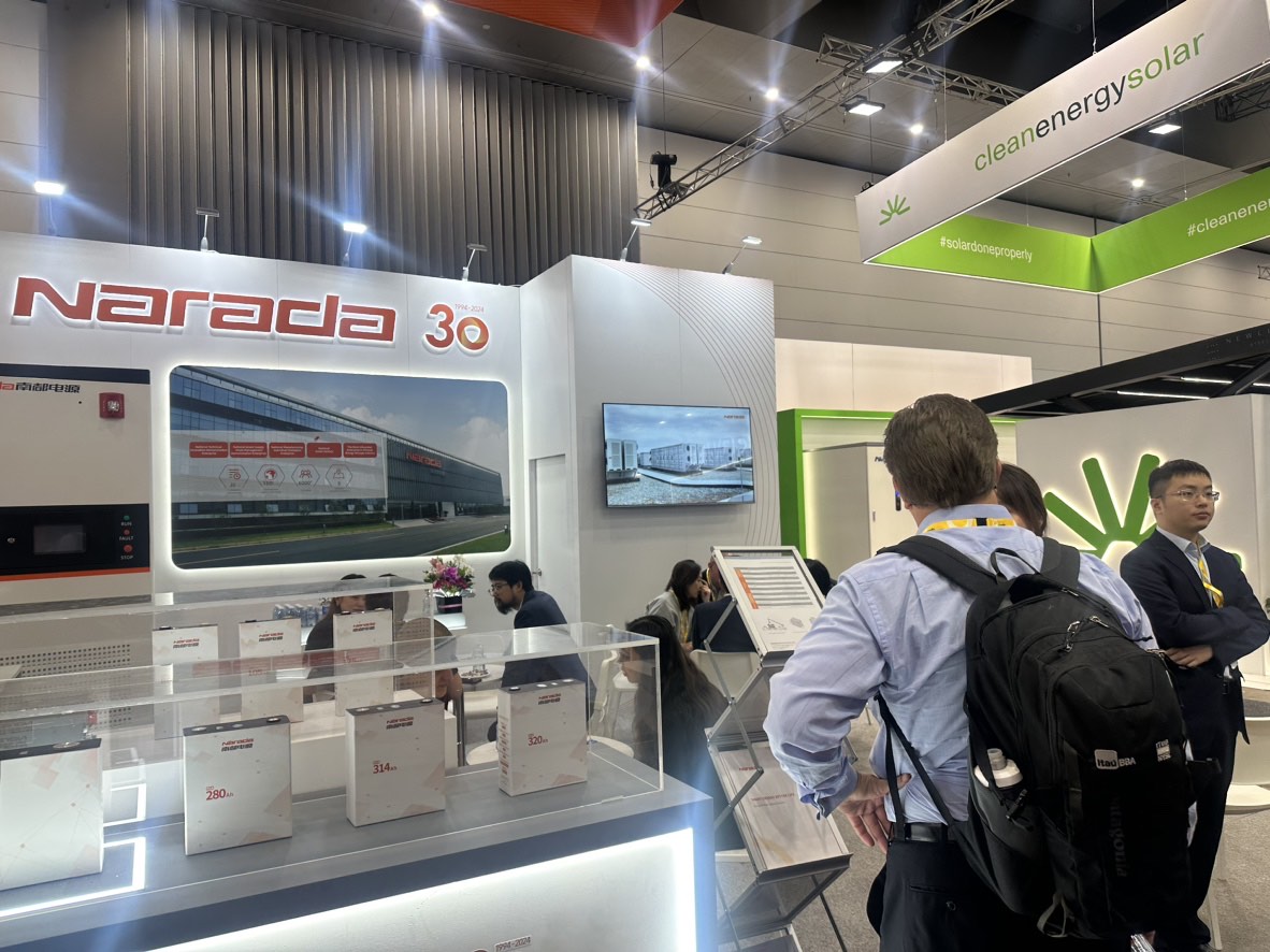 Narada Power showcased several energy storage products and solutions, including the Center L Plus 6MWh+ Liquid Cooling Energy Storage System, 80Ah-690Ah energy storage battery, and the Edge233L Liquid Cooling All-in-one Cabinet, highlighting the company’s innovative achievements.